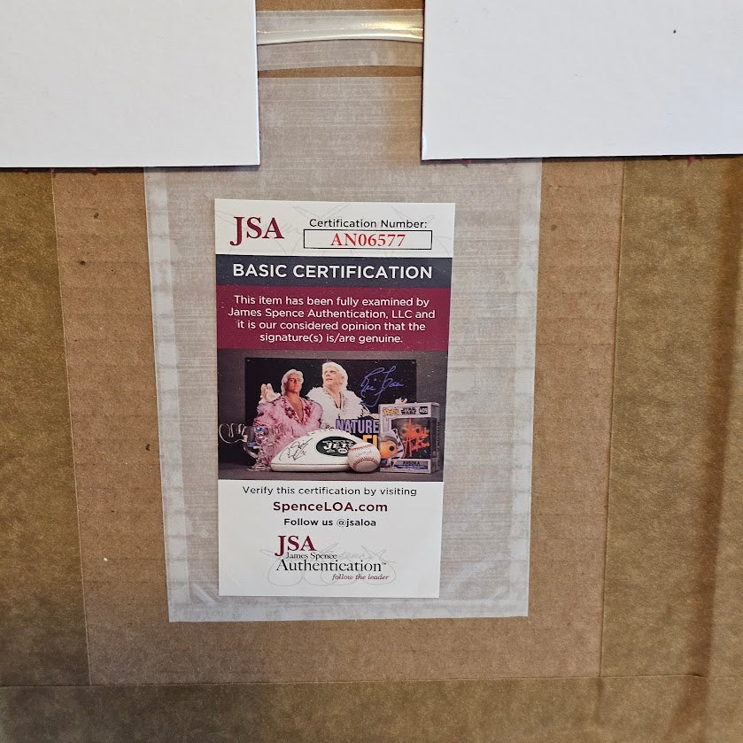 Item is professionally framed featuring double matting. The frame is made of wood. The picture frame is wrapped to ensure it will not be scratched. Please see picture for frame details. This ensures your investment is not damaged, bent or faded. This item is is gift ready.