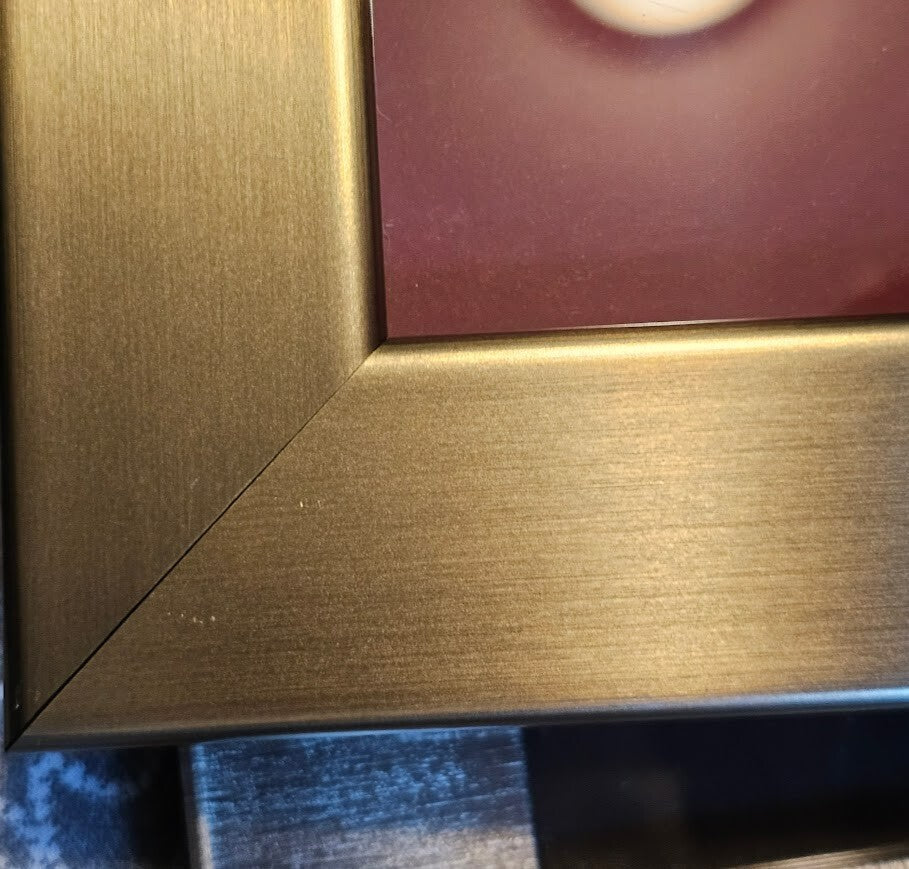 Item is professionally framed featuring double matting. The frame is made of wood. The picture frame is wrapped to ensure it will not be scratched. Please see picture for frame details. This ensures your investment is not damaged, bent or faded. This item is is gift ready.